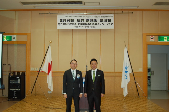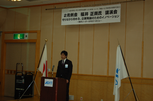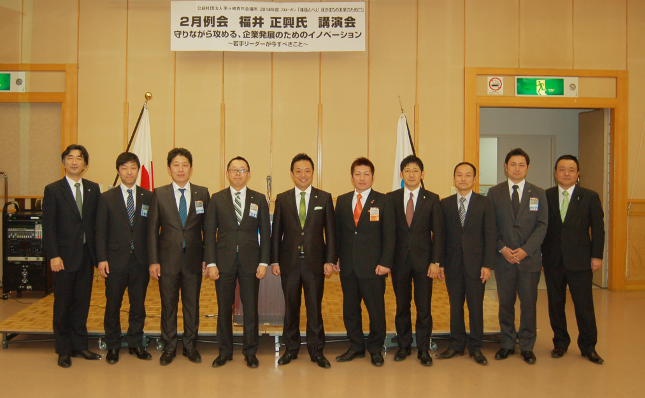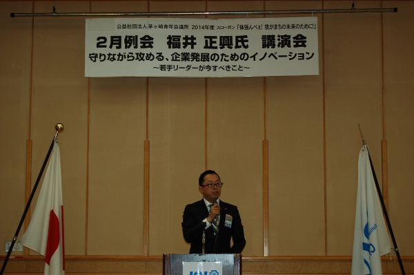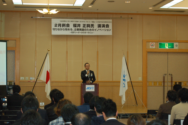 2014年2月27日、茅ヶ崎市役所コミュニティーホールにて、株式会社福寿園取締役社長の福井正興様をお招きし、経営開発セミナーを開催いたしました。「守りながら攻める、企業発展のためのイノベーション ~若手リーダーが今すべきこと~」をテーマとし、責任世代と言われる私たち20代~30代に求められる行動指針をお話しいただきました。